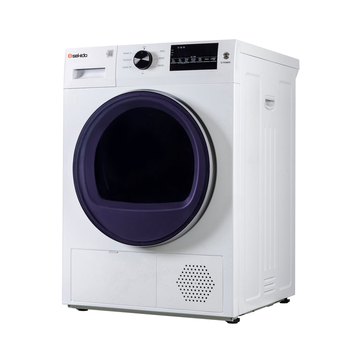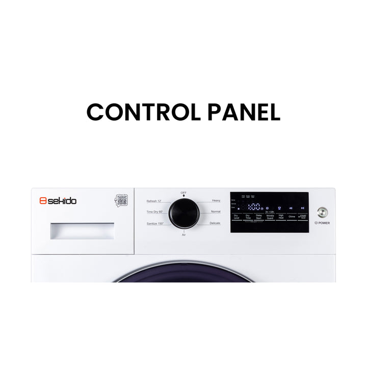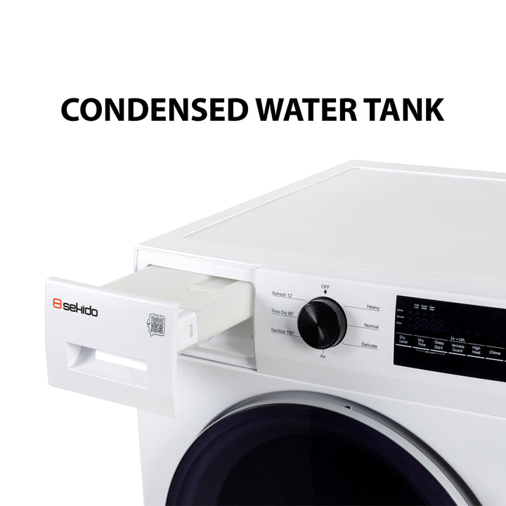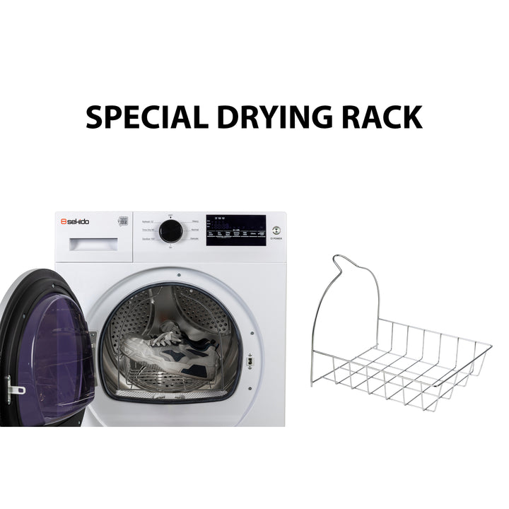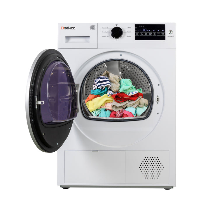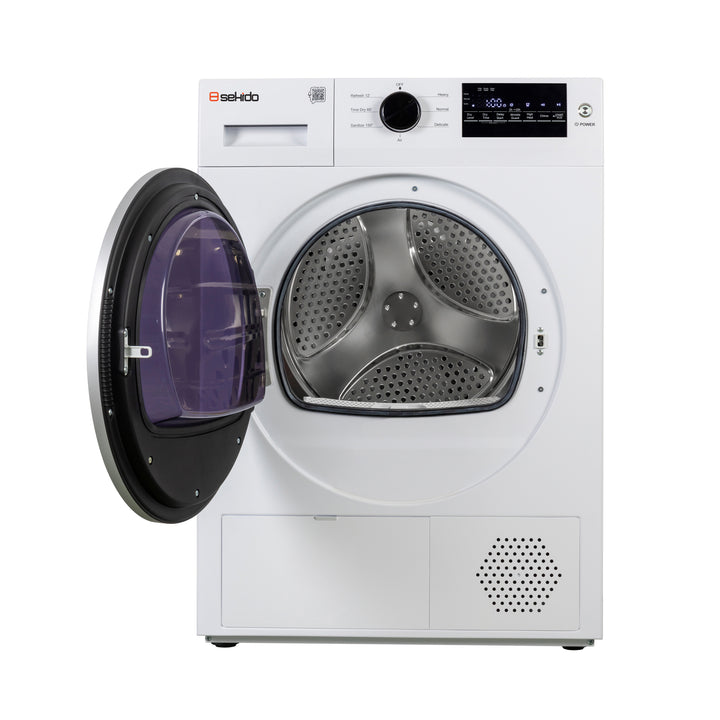 Experience the future of laundry care with the Sekido SK 890 HP Heat Pump Dryer. Designed for both efficiency and sustainability, this compact yet powerful 110 V dryer is perfect for homes where space is limited but high performance is essential. With a generous 3.7 cu.ft capacity, you can dry up to 20 lbs of laundry, making it ideal for everything from delicate fabrics to heavy bedding. Its ventless design and advanced heat pump technology ensure energy-efficient drying while preserving the quality of your clothes. Offering seven drying programs, including Air, Heavy, Delicate, and a Sanitize dry option, the SK 890 is equipped to handle various laundry needs. A special drying rack gently dries your shoes, coats, and delicates and prevents tumbling. At the same time, its built-in humidity sensor automatically stops the dryer when your laundry is perfectly dry, preventing wrinkles and saving energy. With a compact design of 34 x 24 x 26 (HxWxD) inches, and featuring a touch control panel and LED lights, the SK 890 complements any home décor. Key features include a Wrinkle Guard function, a Refresh program, a quiet 66 dB noise level, and Over Heat Auto Control for added safety. Whether you're stacking it with your washer or using it as a freestanding unit, the SK 890 HP offers flexibility, convenience, and peace of mind with its 1-year parts and labor warranty.                                                  "