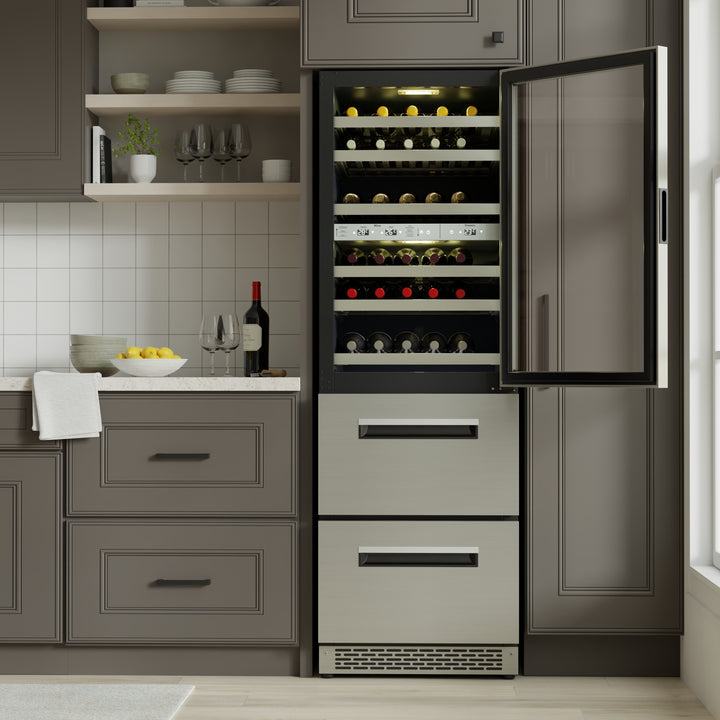 Enhance your diverse wine and beverage collection with the WRD2 108 Combo Wine Refrigerator. With a modern stainless steel finish, this refrigerator offers a total capacity of 17 cubic feet, ensuring ample space for up to 84  bottles. Organize your wine storage with temperature-controlled shelves. The top 3 shelves are ideal for white wines (41°F/54°F). The lower 3 shelves are ideal for red wines (54°F/65°F). This refrigerator's standout features include dual refrigerator drawers. The top drawer has a capacity of 2.5 cu. ft. and the bottom drawer has a capacity of 2.4 cu. ft., allowing for ample storage. It also boasts a triple temperature zone that allows you to store various beverages and preserved foods at their optimal temperatures. Additionally, this wine refrigerator lets you illuminate your collection with seven color LED lights. The drawers also have interior LED lights for enhanced visibility. The WRD2 108, measuring 72 x 26 x 23 inches (HxWxD) for flexible placement in any kitchen, wine room, cellar, basement bar, or your chosen space, offers both built-in and freestanding installation options. It boasts a suite of other features such as auto defrost technology, a touch control panel, anti-UV glass shields to protect the value of your wines. Additionally, it has reversible doors, adjustable shelves, and a recessed handle for a sleek and convenient design. Complemented by a 1-year parts and labor warranty, this wine refrigerator is the ultimate companion for wine enthusiasts.